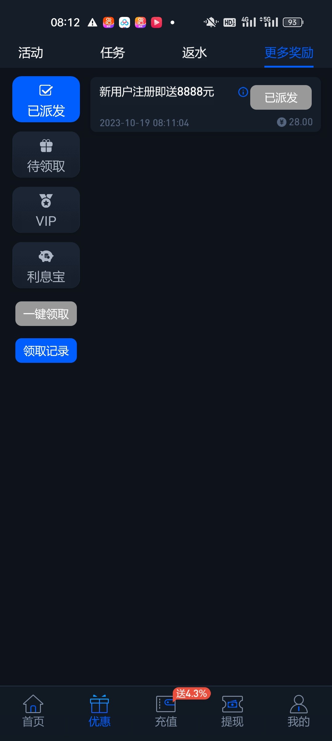 不是自动送,需要优惠里申请