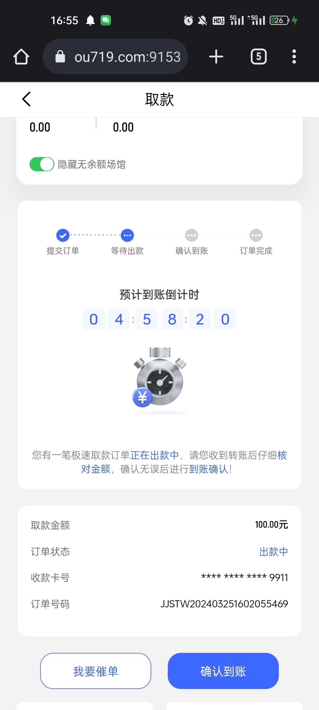 提了一个小时终于到账了