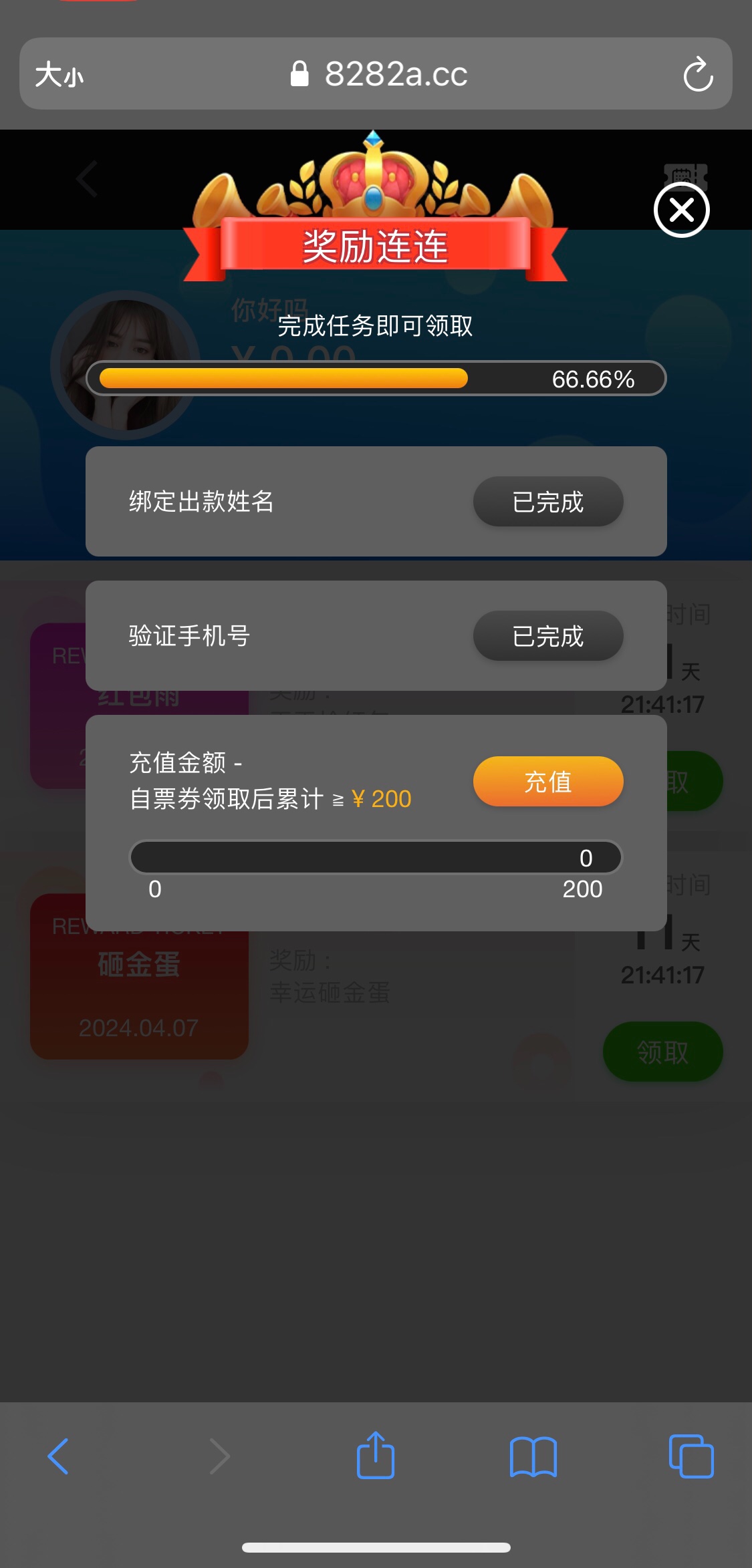 应该是特邀碰瓷吧反正我几个手机号都有 提款自测没打出来 注册完直接个人中心奖励中心领https://www.8282a.cc/m/home