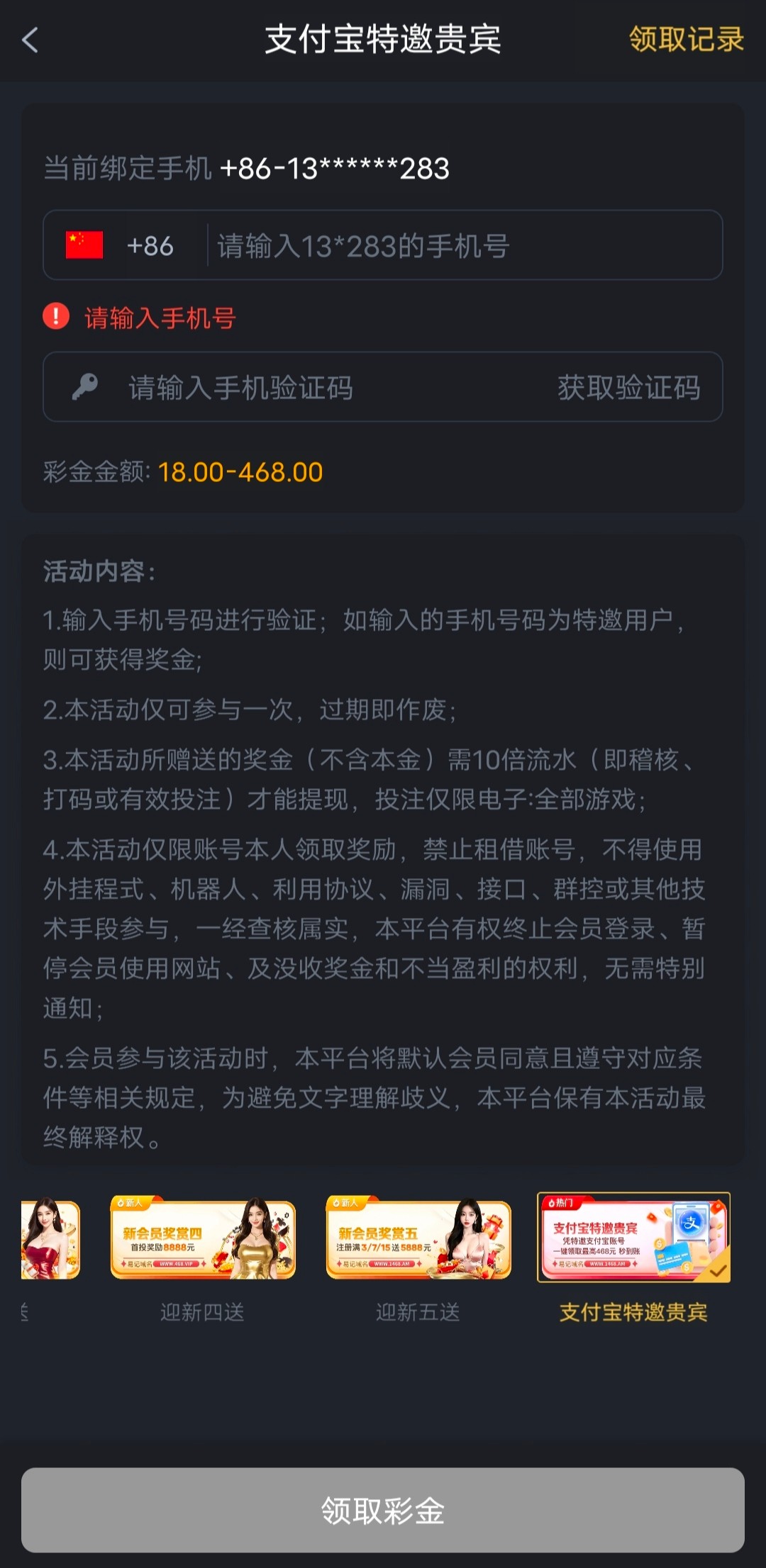注册后活动大厅输入号码自己申请,先试试支付宝的,支付宝不行再试试电话的,能收到验证码再下载APP,碰不到无视。