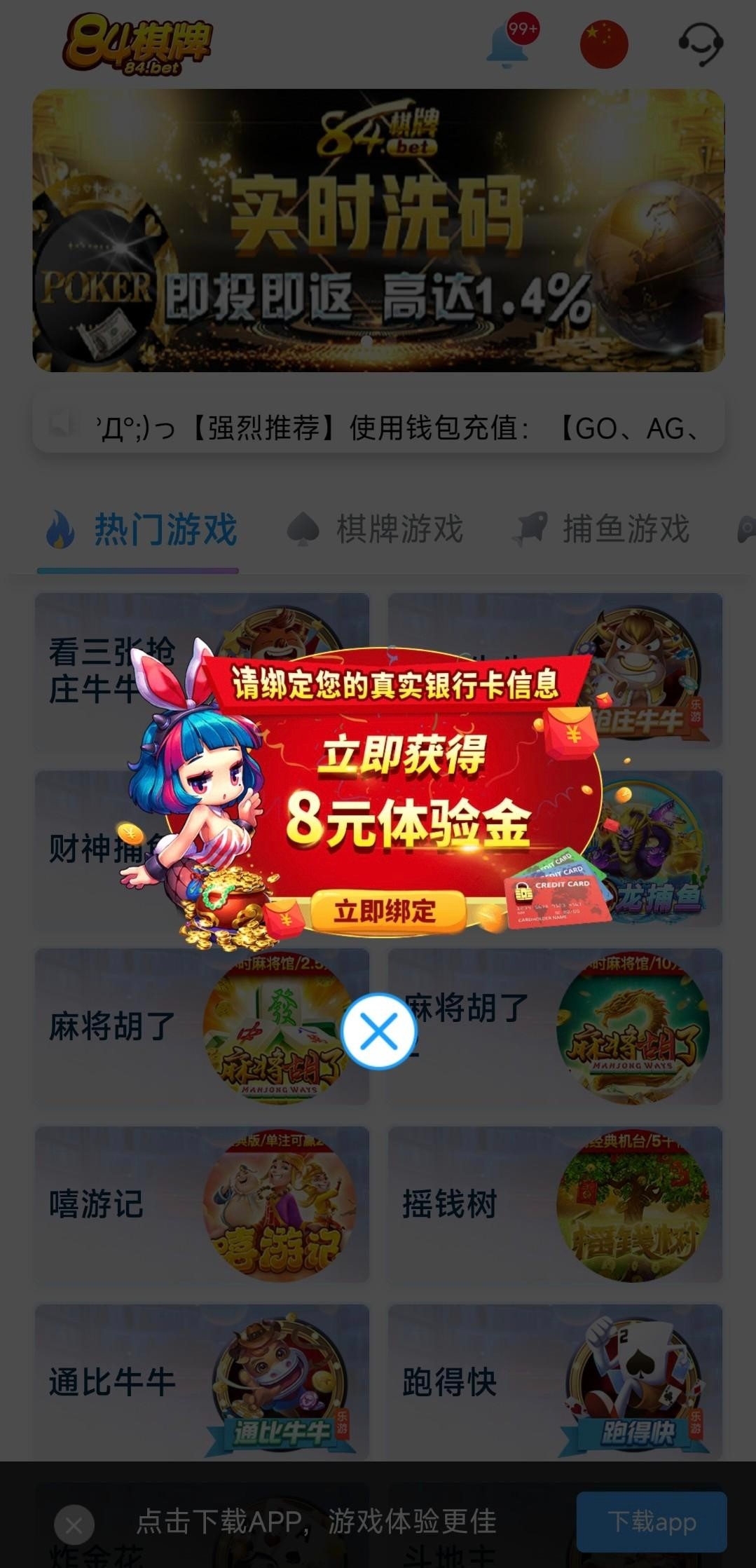 可领取8彩金,然后点立即绑定去绑一下卡(重名的加上任意数字到时候能联系客服修改)绑定完再到主页这个活动就不弹出来了,