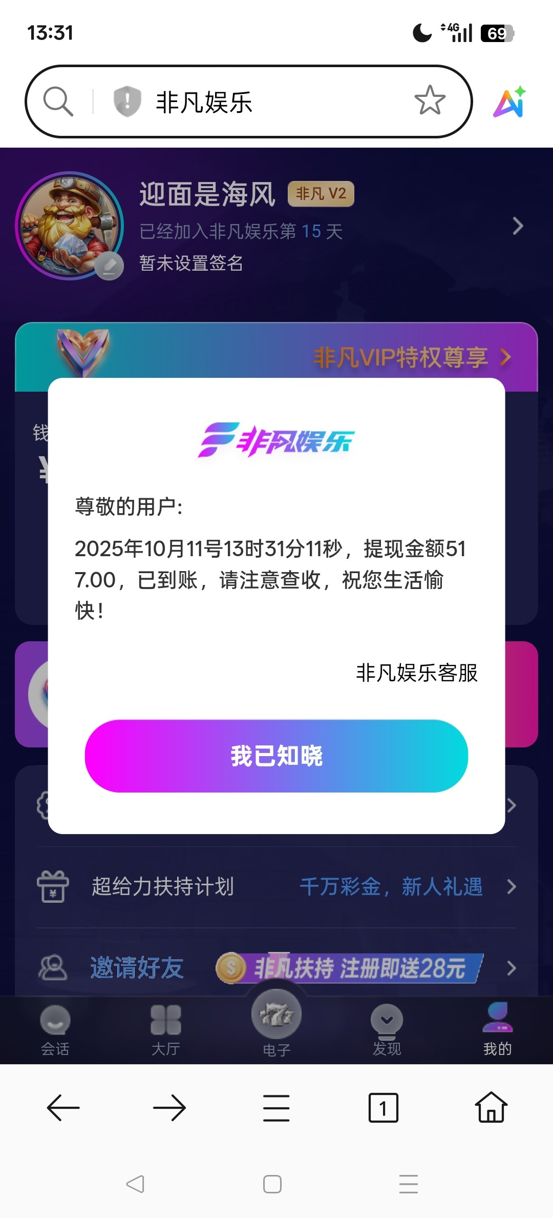 非凡娱乐只支持一个cgpay电子钱包,钱能钱包啥的都没,所以我提了支付宝,收了17手续费(有点贵哈哈),