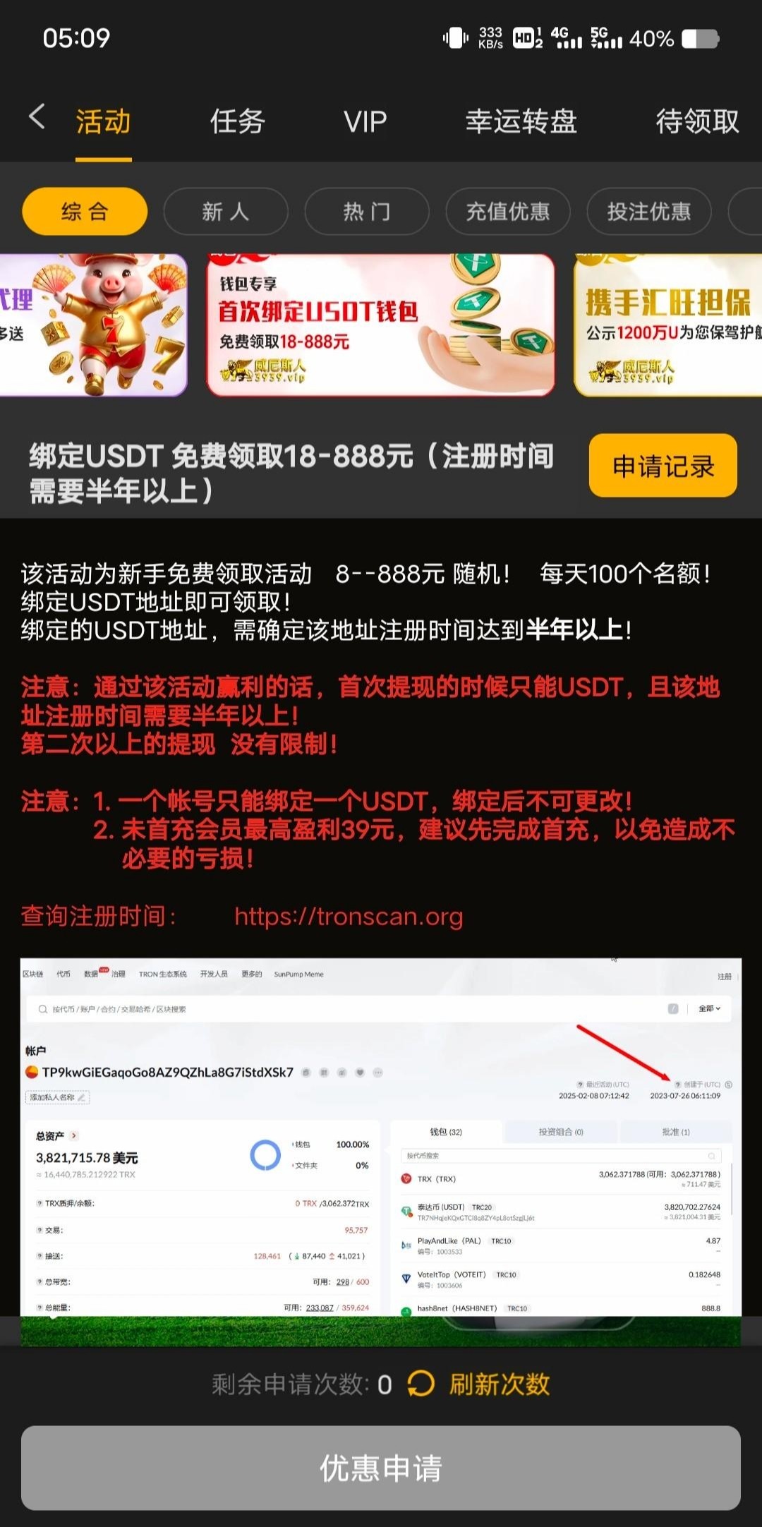 链接3939.com 绑定半年u地址送18 短信里面翻到的,下载 app 在活动里面申请,我几分钟就给了 没打出来,