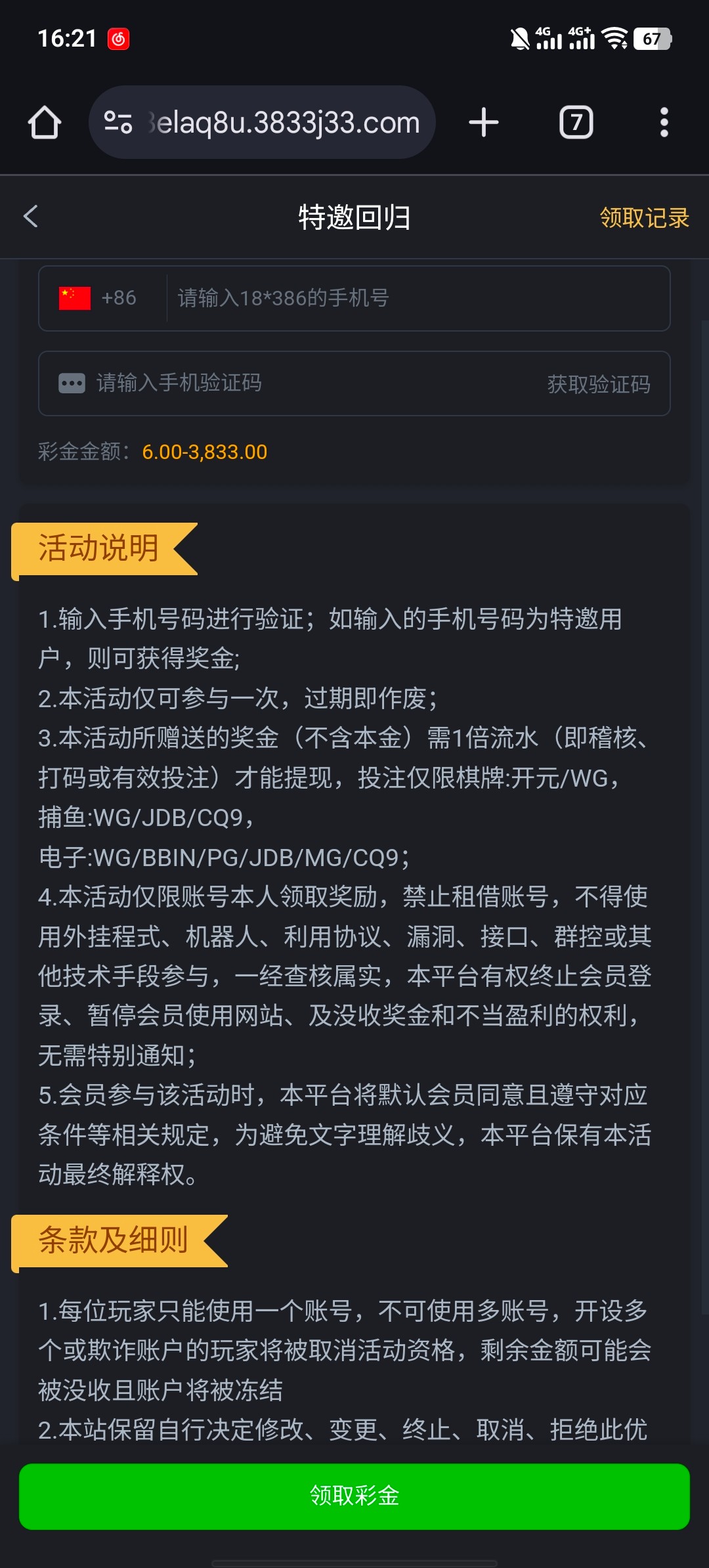 3833电话回归彩金