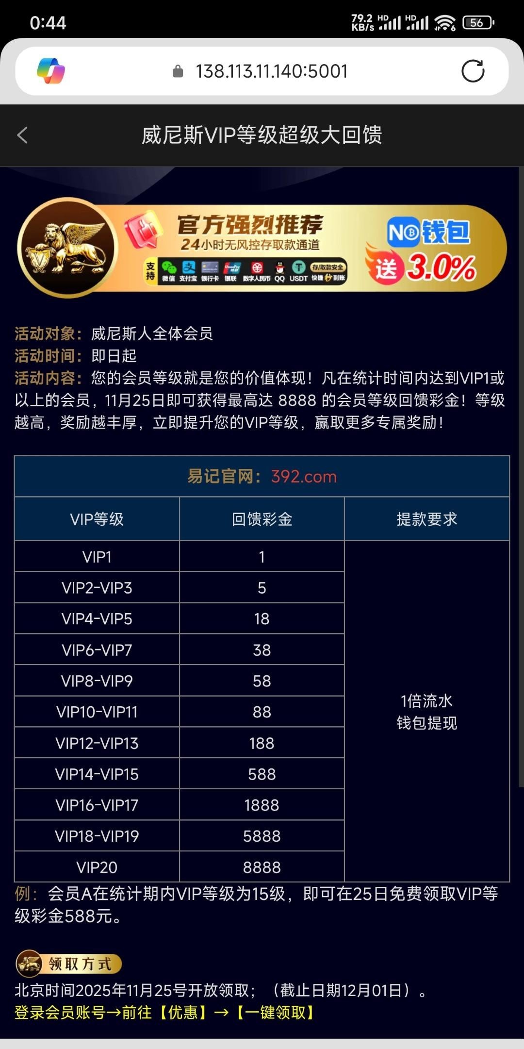 有VIP等级就可以领取,打一倍流水,最低提现10元起