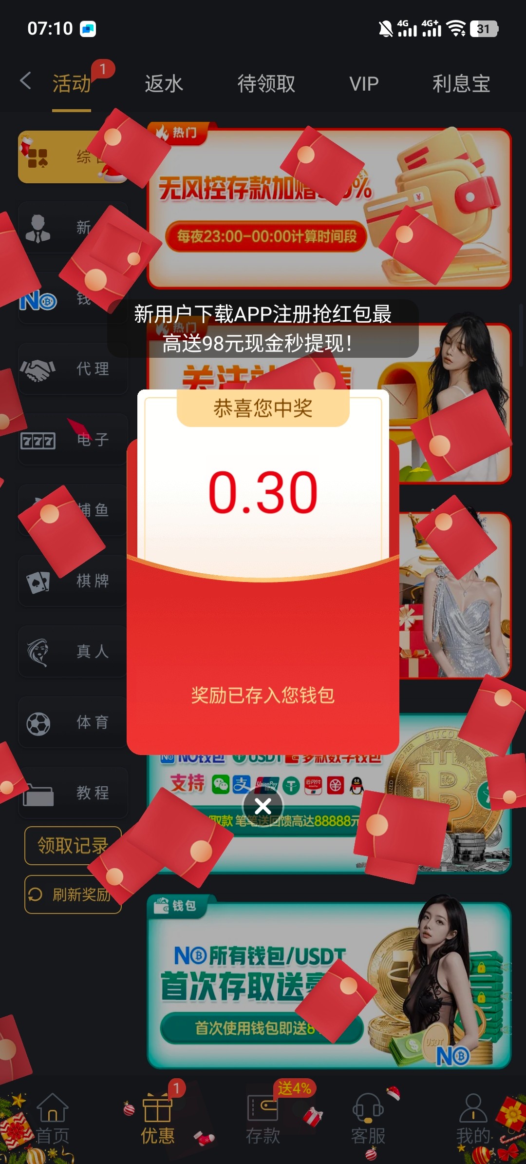 下载app 注册账号 绑定信息 自动弹出新人红包 随机派送 我是接到短信特邀去的 赌神彩金