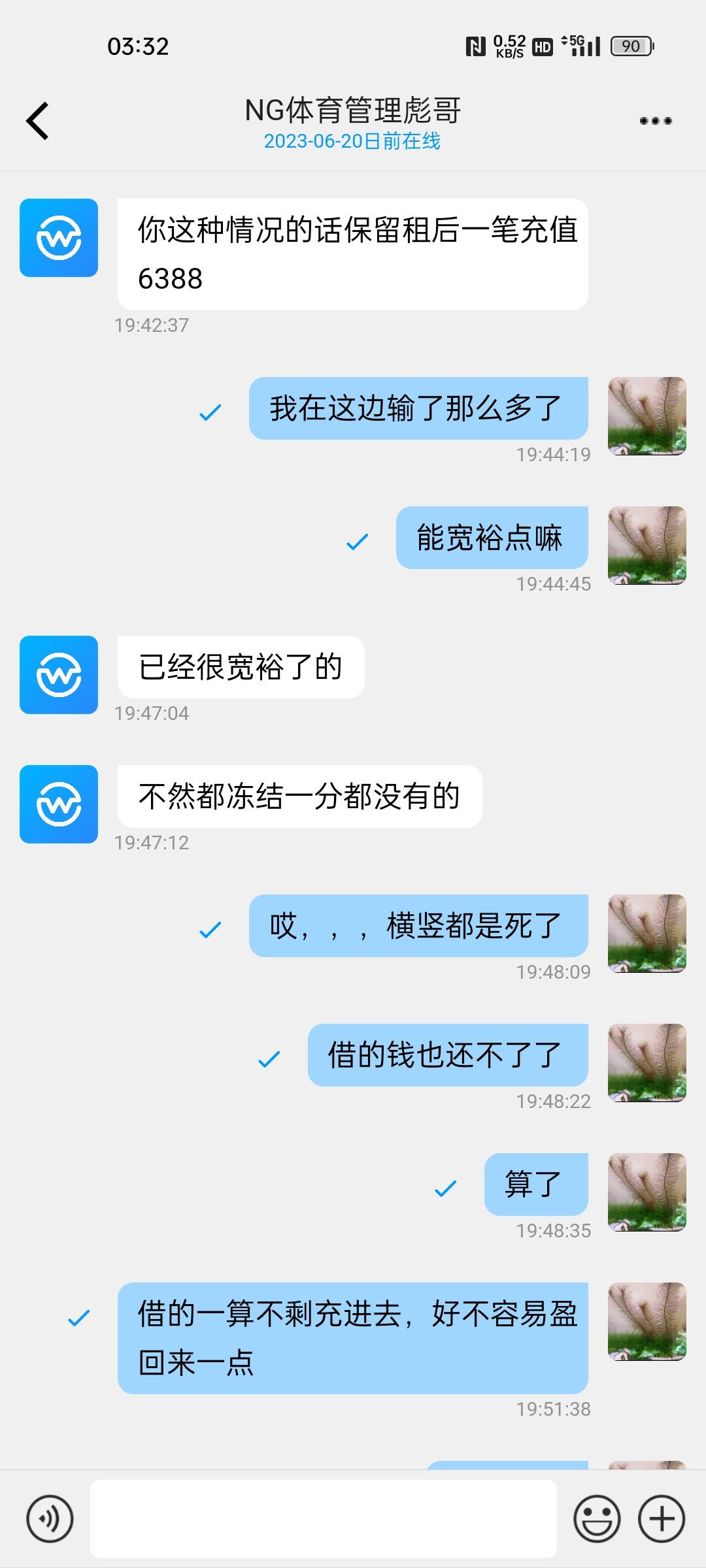 充值5000输光,接着充6388玩了快十个w的流水,盈到帐户1.5w多提现被冻结帐户!找客服说对压,而且吓唬说承认对压就能出最后一笔充值,不然毛都没?真的是牛逼!